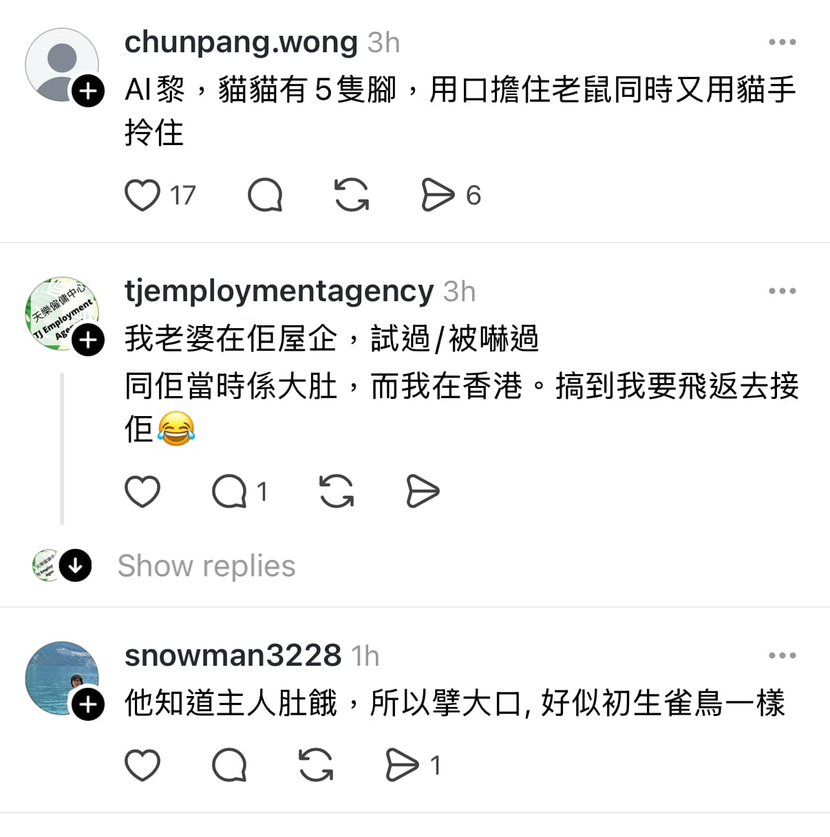 - chunpang.wong :「AI黎,貓貓有5隻腳,用口擔住老鼠同時又用貓手拎住」