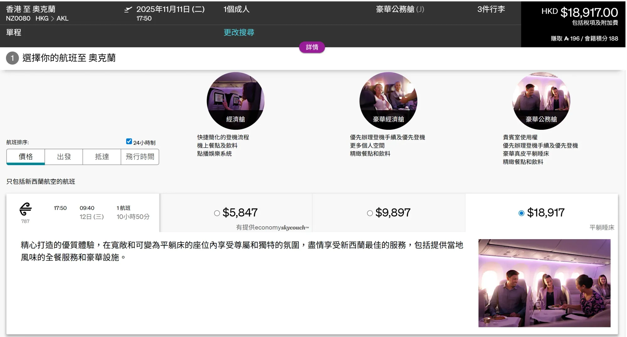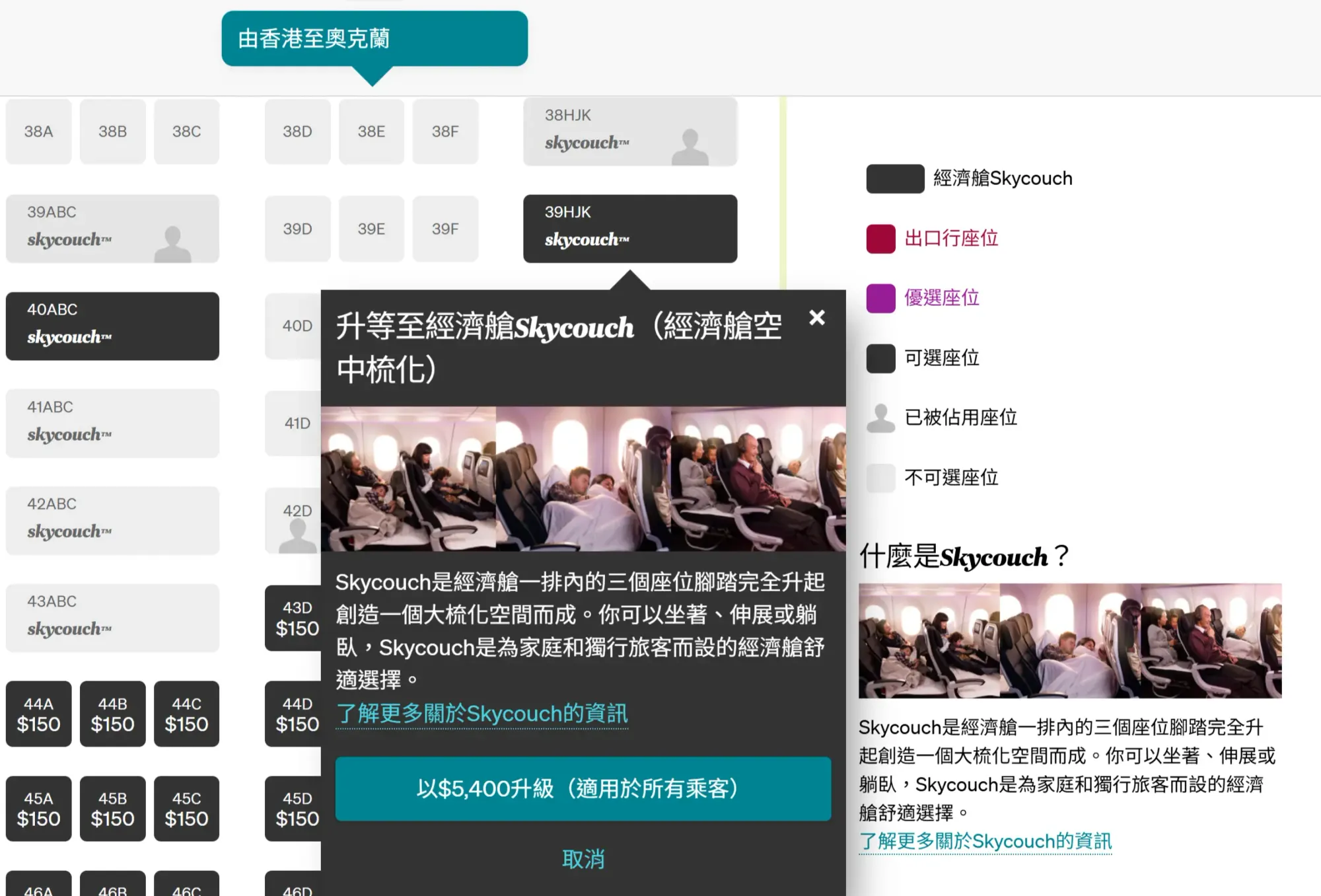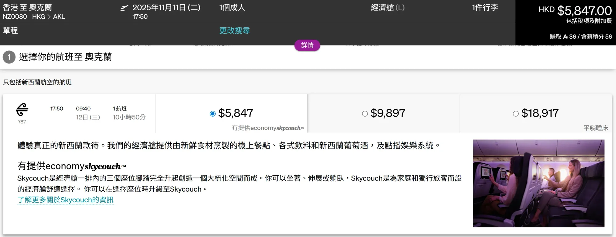 - 抵用過商務艙:以2025年11月11日呢個例子, 香港飛奧克蘭加埋Skycouch都係HK$11,247,比豪華商務艙平成HK$7,670。