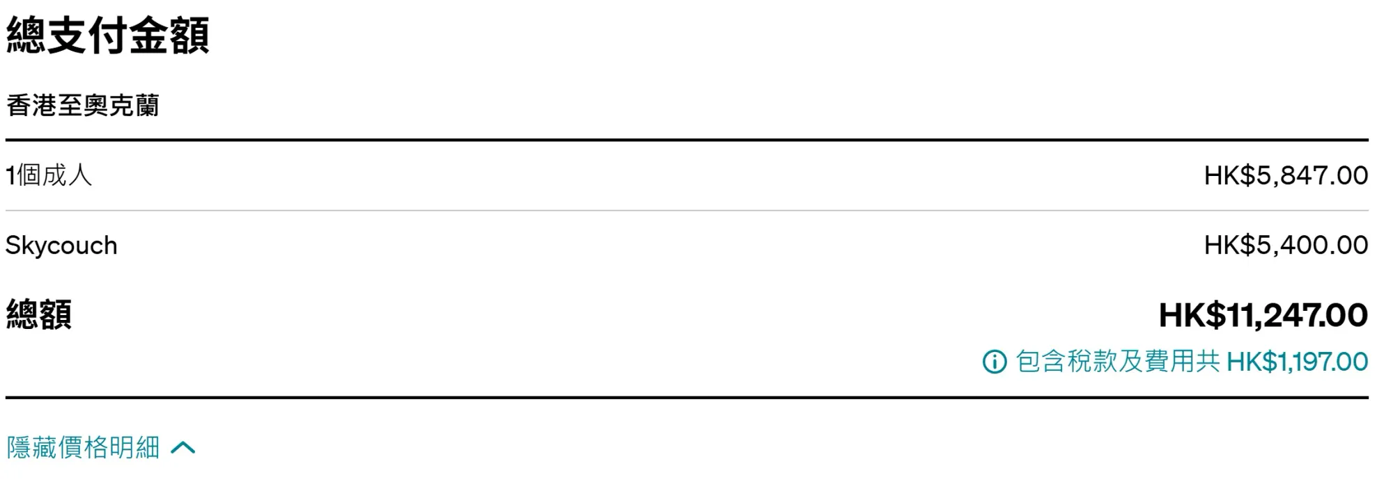 新西蘭航空香港飛奧克蘭,普通經濟艙HK$5,847,加Skycouch HK$5,400,總共HK$11,247。(資料來源:新西蘭航空)