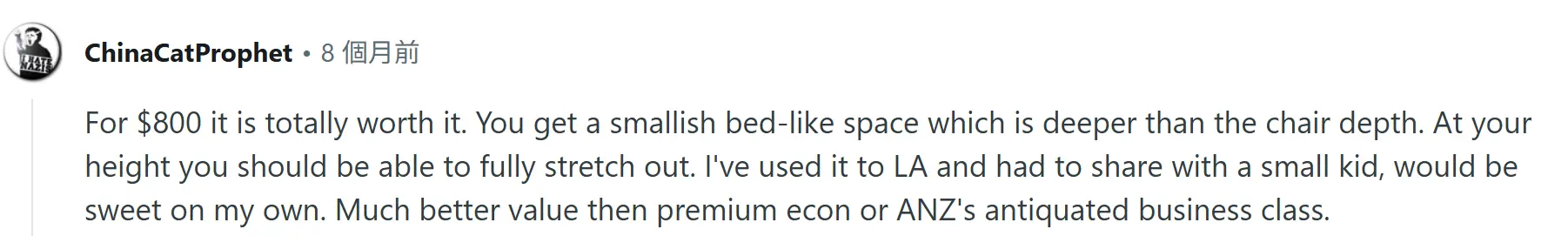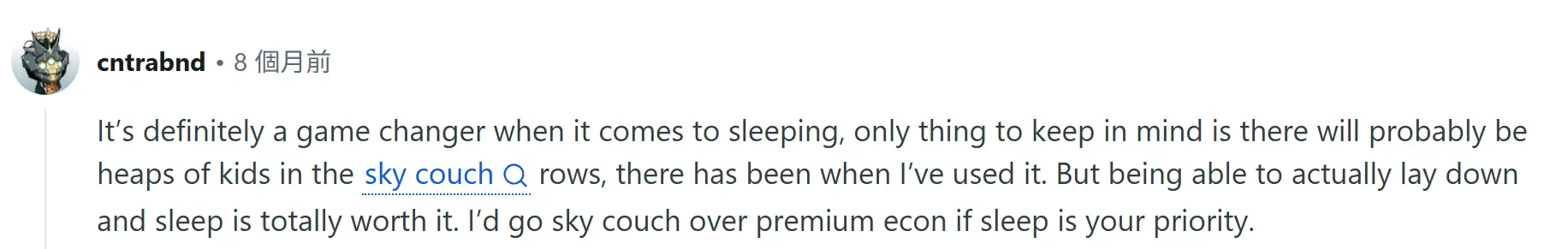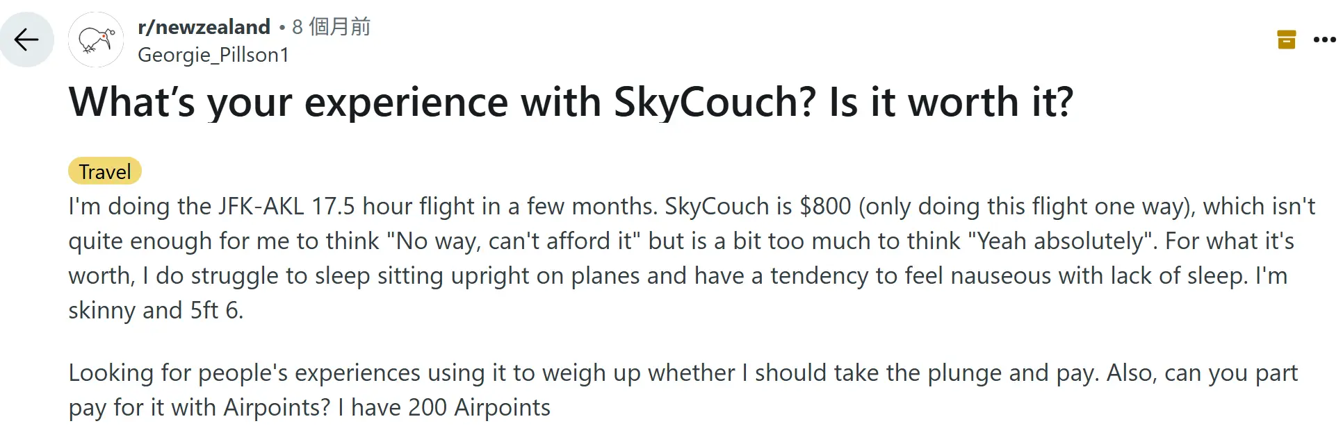 網民喺美國甘迺迪國際機場(JFK)直飛新西蘭奧克蘭(AKL)(17.5小時)用Skycouch嘅真實評價。(資料來源:Reddit)