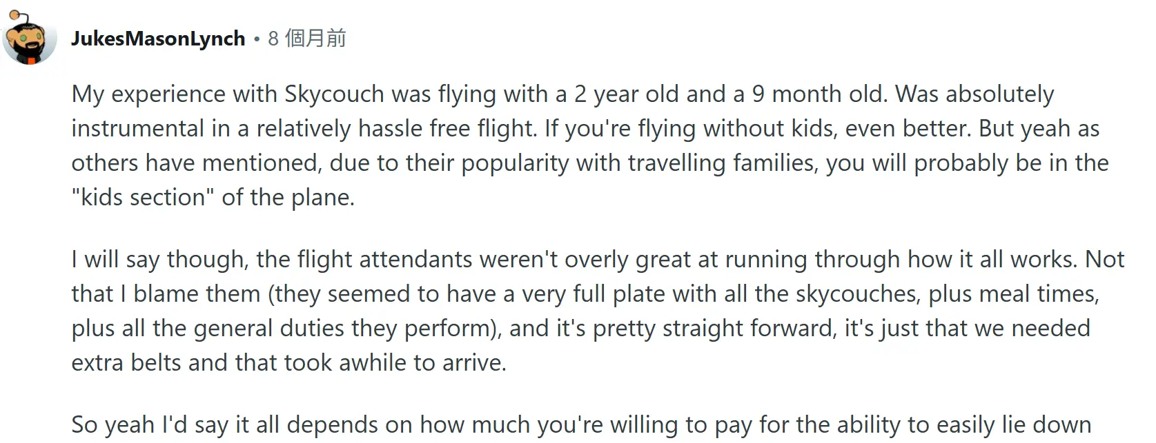 - 啱晒家庭用:帶細路上機最怕佢哋唔肯坐定定。Skycouch變成玩樂區或瞓覺位,父母唔使咁辛苦。Reddit網民話,佢帶18個月BB用Skycouch,慳咗買多張機票錢[3]。