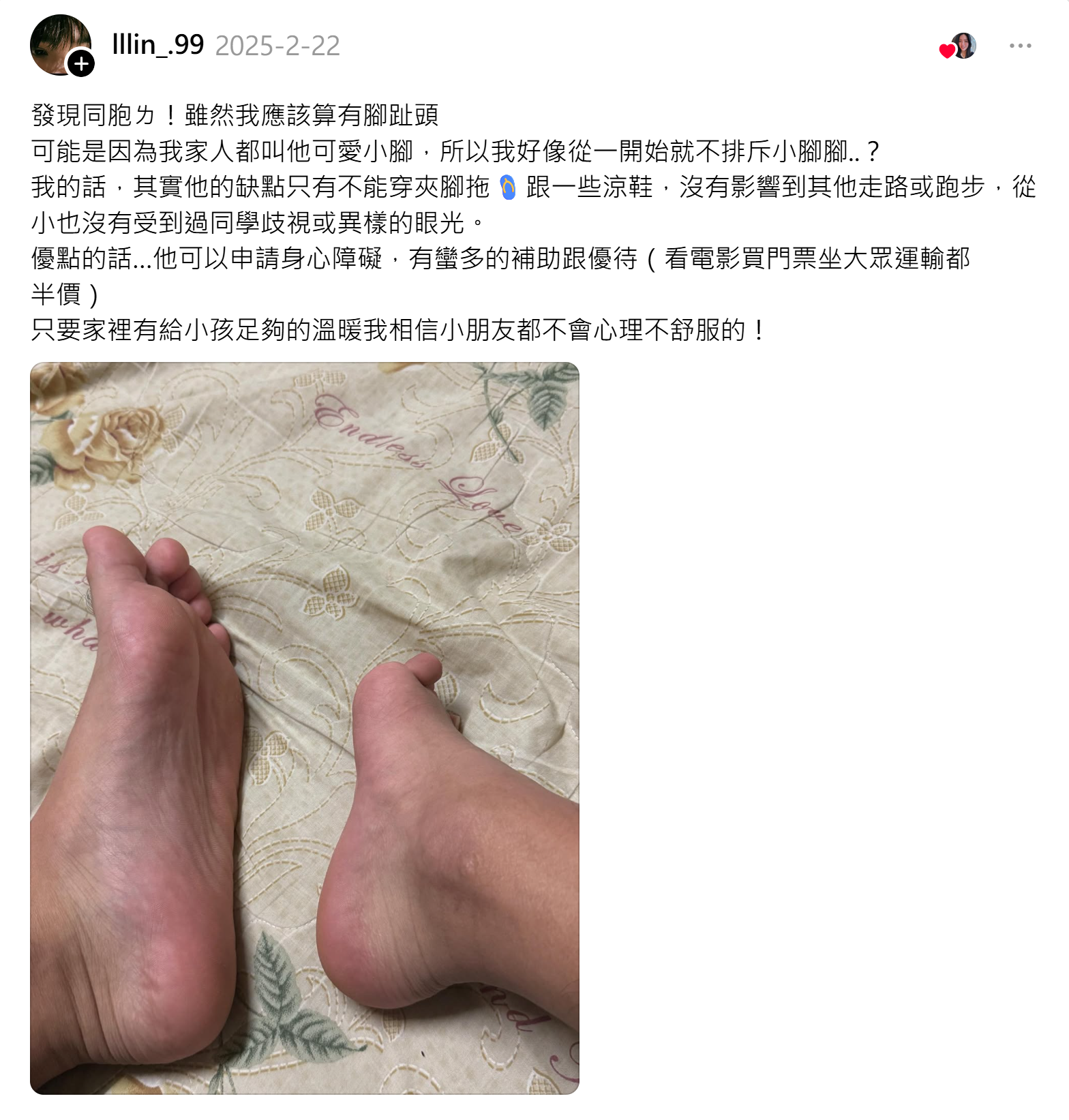 「發現同胞了!」網民 lllin_.99 表示自己雖然有腳趾,但因為腳 型特殊,穿唔到人字拖或某啲涼鞋。不過佢從未被歧視,反而因家人稱呼為「可愛小腳」而感到自豪:「只要家裡有給小孩足夠的溫暖,我相信小朋友都不會心理不舒服的!」