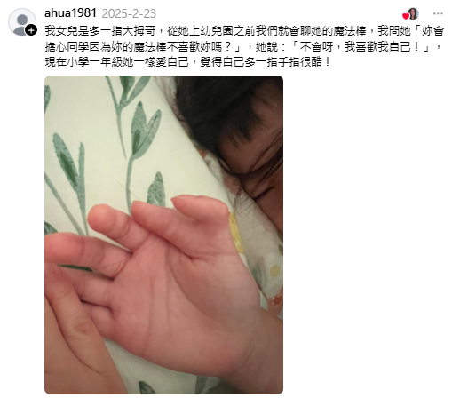 網民 ahua1981 分享女兒天生多一指,家人稱之為「魔法棒」。佢喺幼兒園前就同女兒討論:「妳會擔心同學因為妳的魔法棒不喜歡妳嗎?」女兒回答:「不會呀,我喜歡我自己!」如今升上小學,她依然覺得自己「多一指手指很酷」📚。