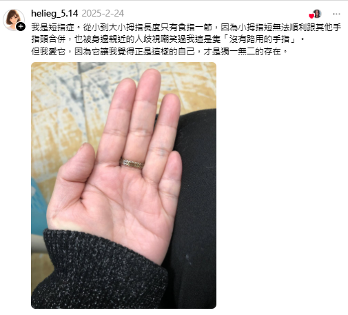 「我愛它,因為它讓我覺得正是這樣的自己,才是獨一無二的存在。」網民 helieg_5.14 從小因短指症被嘲笑「冇路用的手指」,但佢選擇接納自己,並以此為力量來源📚。