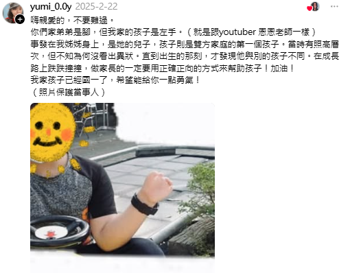 網民 yumi_0.0y 分享姊姊兒子出生時左手異常,雖然有照高層次超音波,但未能發現異狀。孩子係雙方家庭第一個小朋友,成長路上跌跌撞撞,但家人選擇正向面對:「做家長的一定要用正確正向的方式來幫助孩子!」佢希望自己嘅故事能畀其他父母一點勇氣📚