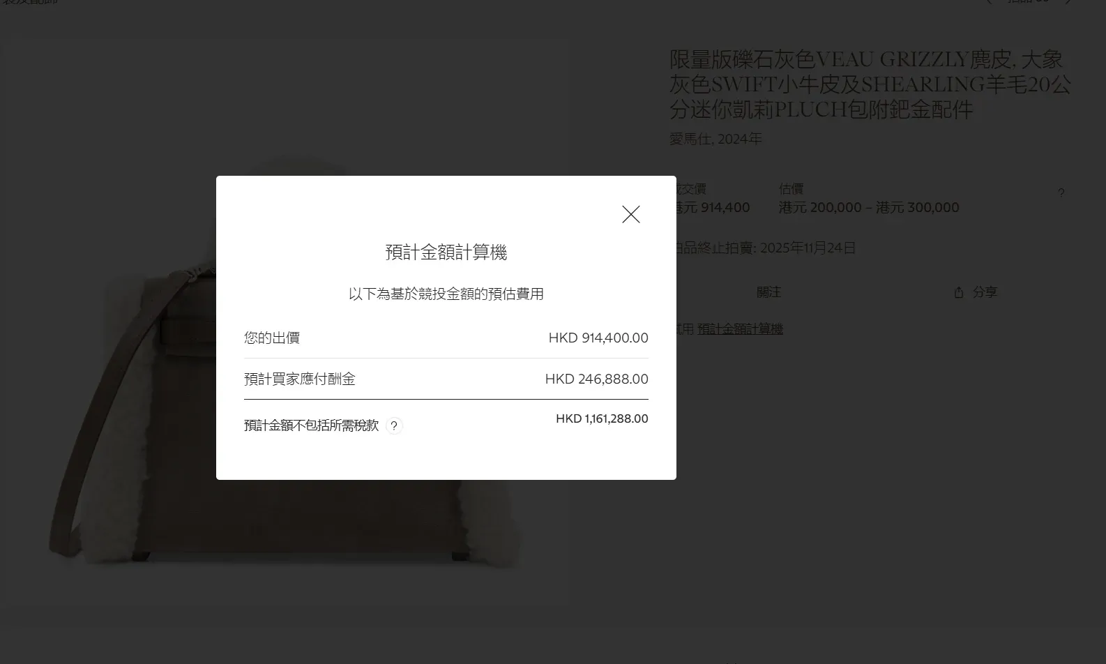 拍賣行公布的成交價,並非買家實際需要支付的最終金額。本文以 Mini Kelly 二代 Teddy 的拍賣案例為例,拆解佳士得(Christie’s)及蘇富比(Sotheby’s)在香港的買家應付酬金結構,說明點解「落槌價」與「實際付款」之間,往往存在明顯差距。