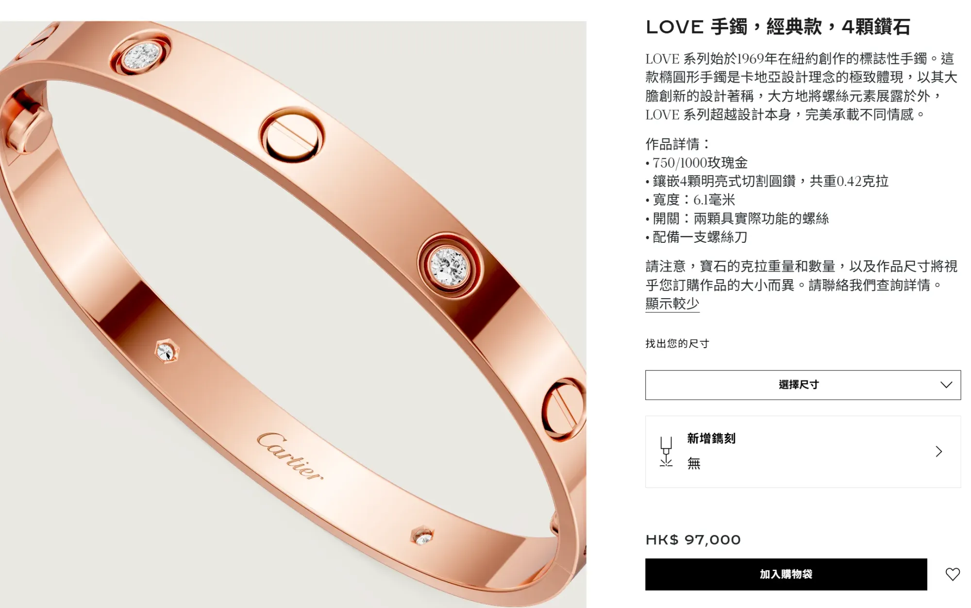 喺 Cartier Love 經典款入面,最多人猶豫嘅,往往唔係「帶鑽定滿鑽」,而係無鑽同4 鑽之間嘅取捨。兩者外形接近,但價錢相差超過三萬港元,令唔少準買家都會停一停,思考差別是否符合自己嘅佩戴需要。