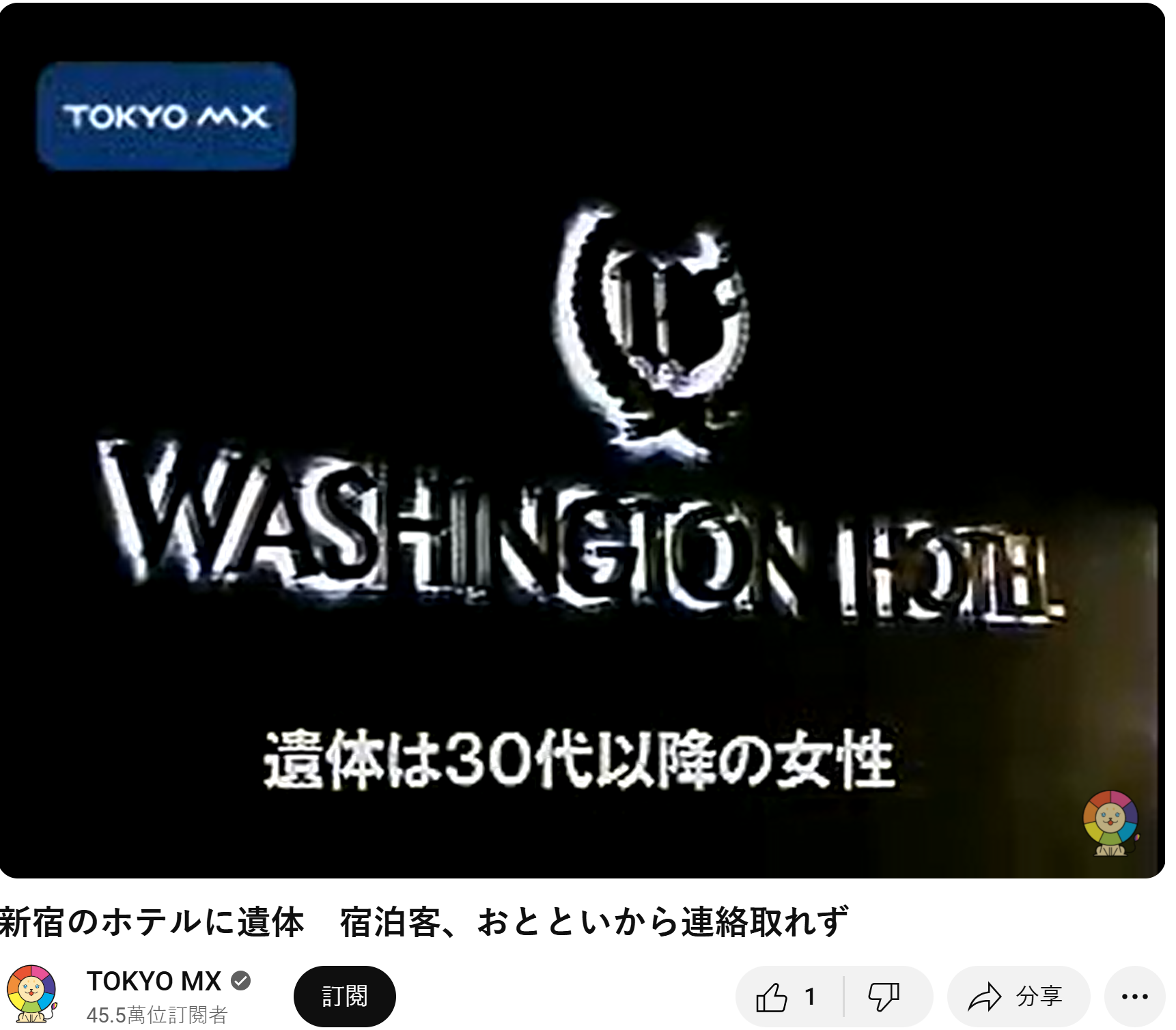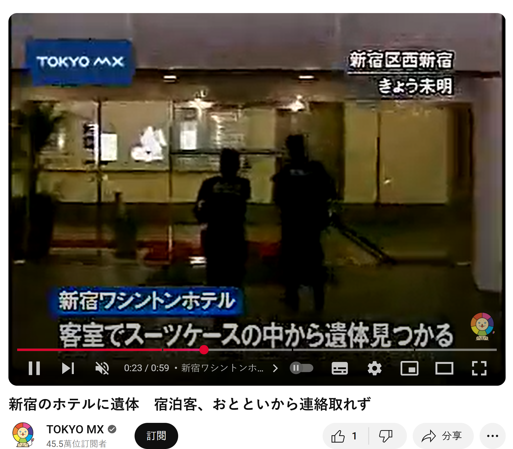 日本新聞轉播2008年東京新宿華盛頓酒店女屍案。(資料來源:Tokyo MX@YouTube)