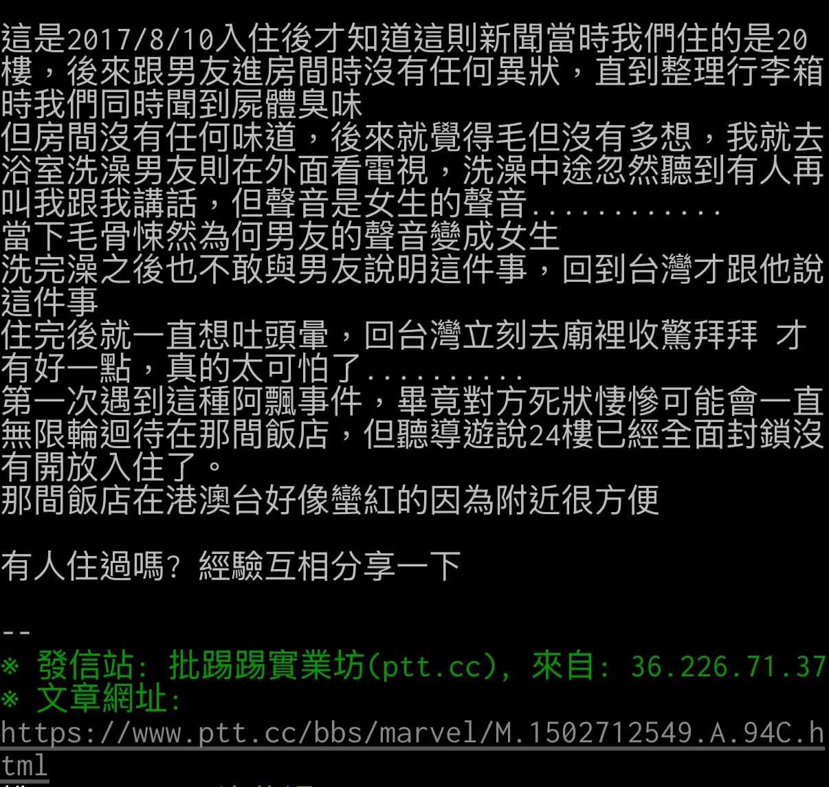台灣網友分享20樓屍臭同浴室女聲嘅驚魂夜。(資料來源:ptt.cc)