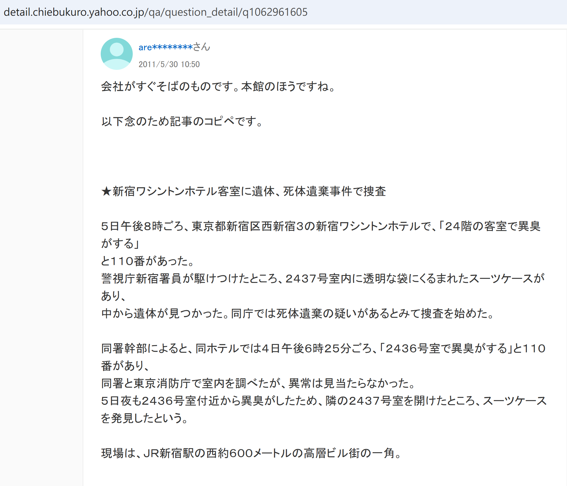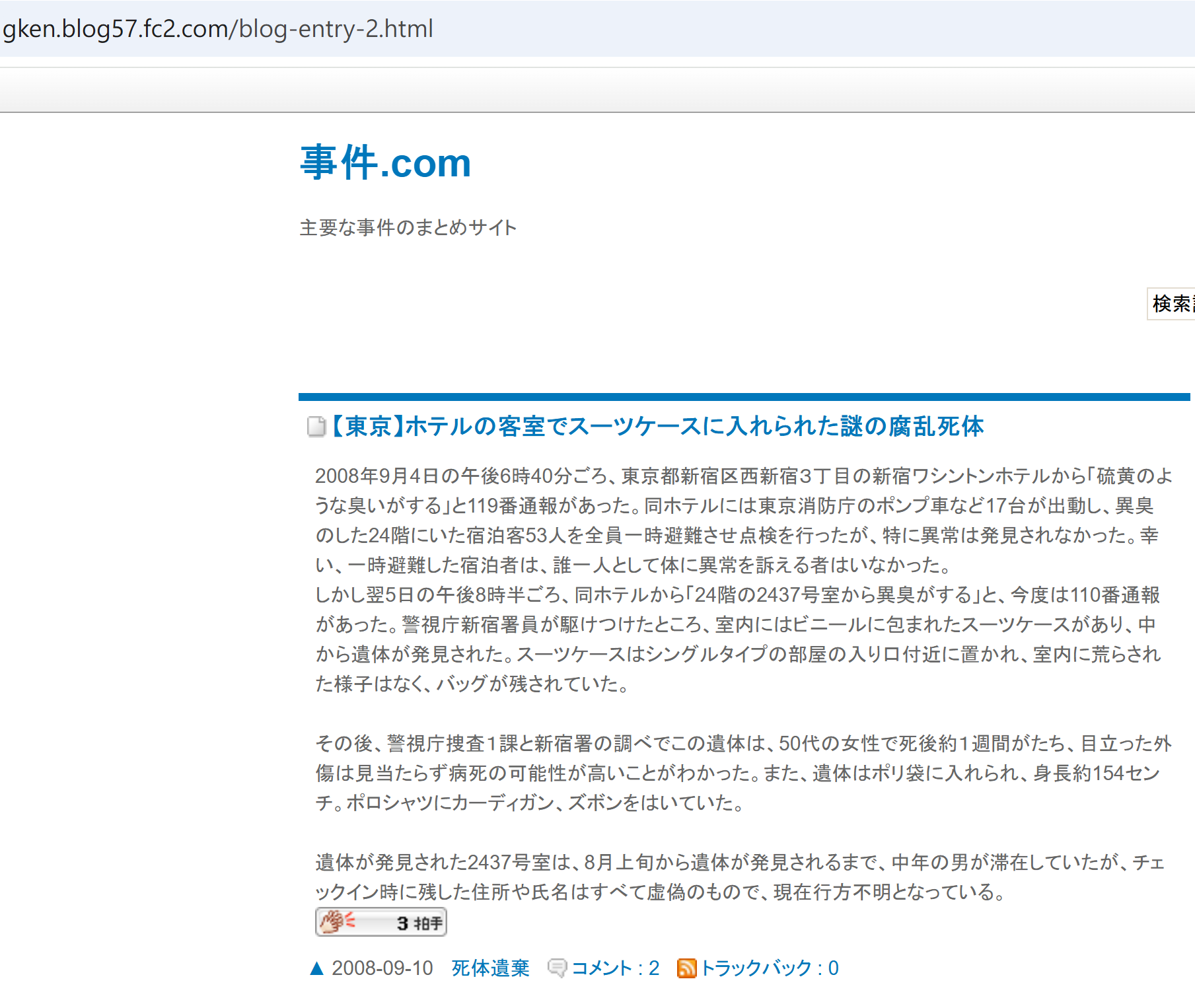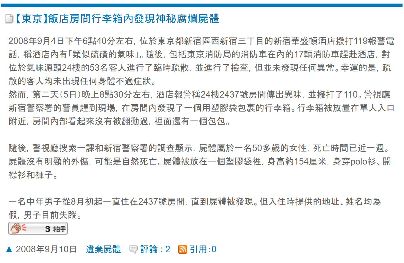 - 恐怖經過:2008年9月5日,新宿華盛頓酒店本館24樓24XX號房傳來陣陣惡臭,清潔阿姨用萬用房卡開門一刻,臭味撲鼻而來,嚇到即刻關門!😷 佢憑多年經驗,覺得唔係普通垃圾味,急召主管同保安入房檢查。點知喺房間角落一個行李箱,發現一具女屍!😱 死者係50至60歲女性,屍體腐爛超過7日,呈不自然姿勢被硬塞入行李箱,法醫指死亡時間約8月底。