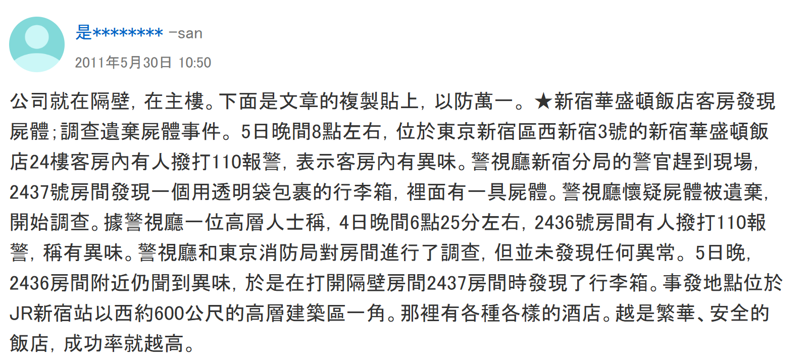 3. 台灣網友(PTT分享):2437號房附近怪味同拖行聲 🛍️😷