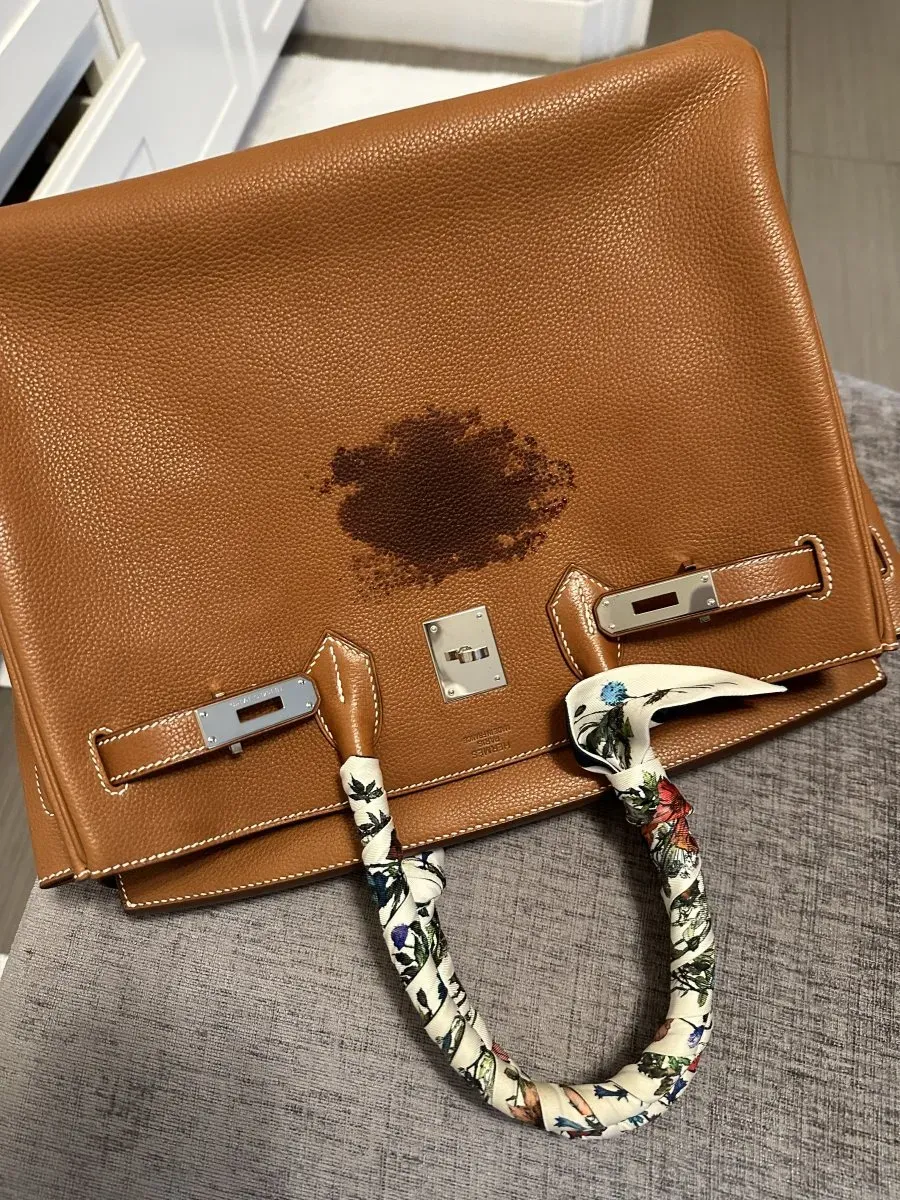 有用家分享,一個相對極端嘅情況——早餐燕麥(oatmeal)整碗倒落 Birkin 35(BF 皮革)上。佢即時進行簡單處理: