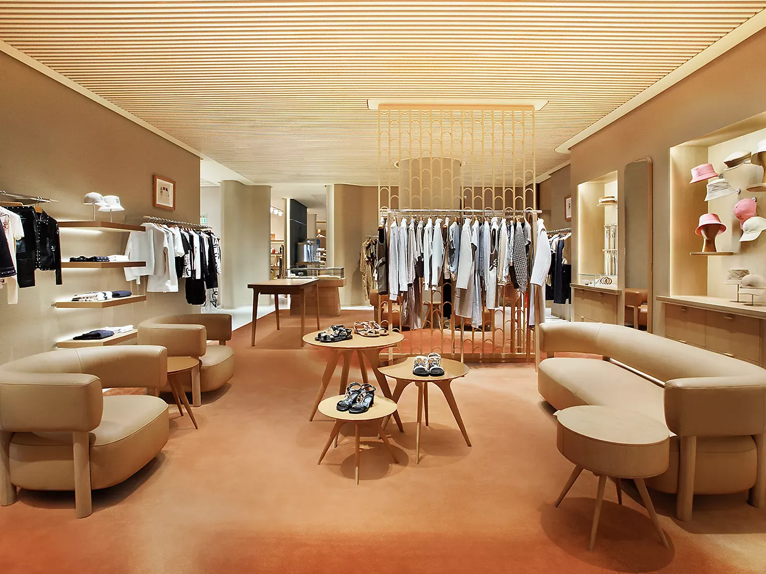 新店嘅整體設計繼續由一直與品牌合作無間嘅巴黎建築事務所 RDAI 負責操刀。喺外觀方面,最引人注目嘅亮點係店舖全新打造嘅外牆。設計團隊特別採用咗羽毛形狀嘅陶瓷磚去覆蓋外牆表面,拼湊出猶如神話生物鳳凰嘅羽毛紋理,呈現出鮮明同生動嘅視覺效果。呢個設計唔單止呼應咗中國神話傳說,亦都巧妙咁展現出傳統美學與現代創新之間嘅對話。
