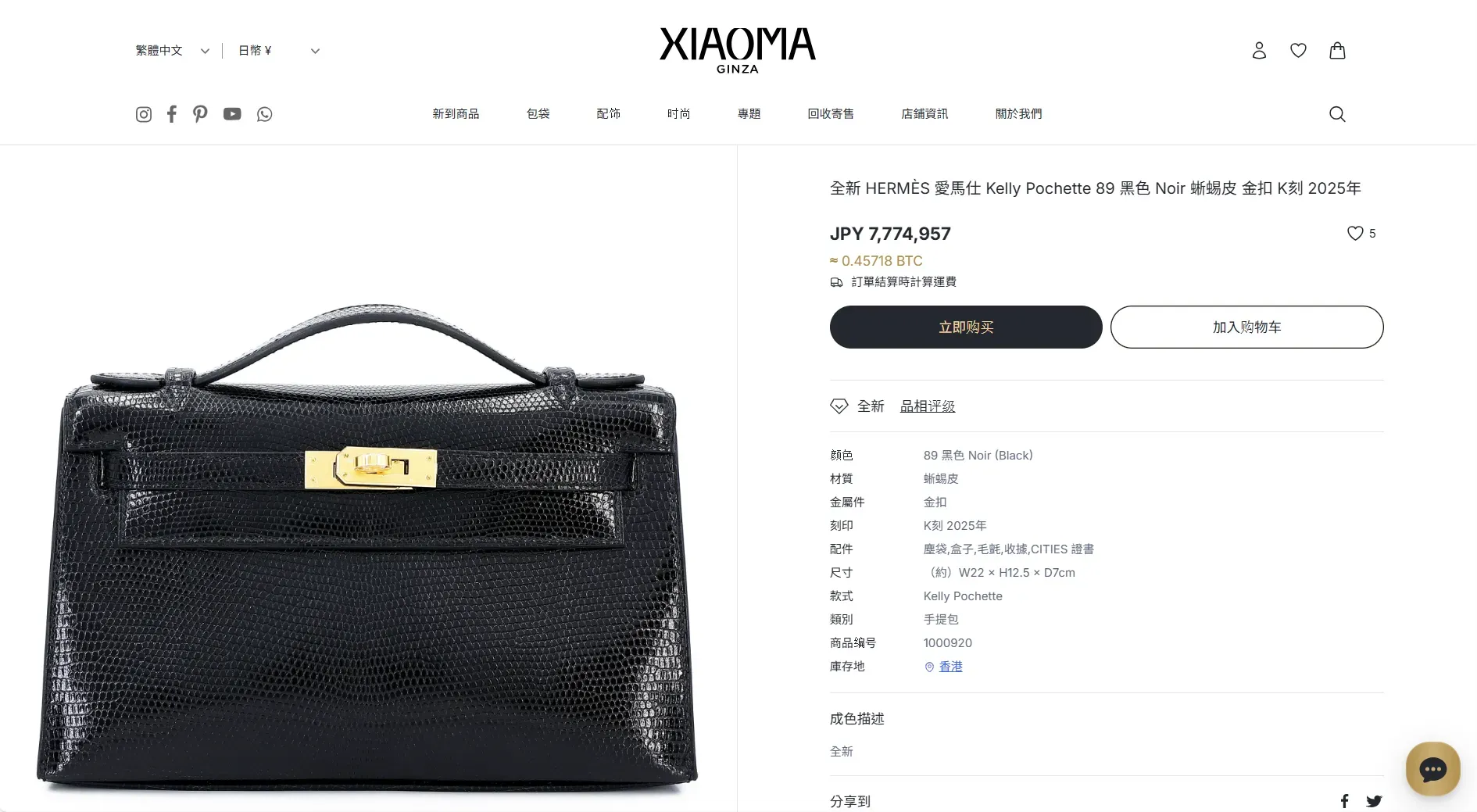 | 平台(XIAOMA Ginza) | JPY 7,774,957 | 約 HK$40萬 | 黑色蜥蜴皮 + 金扣; 全新、K刻、2025年製 |