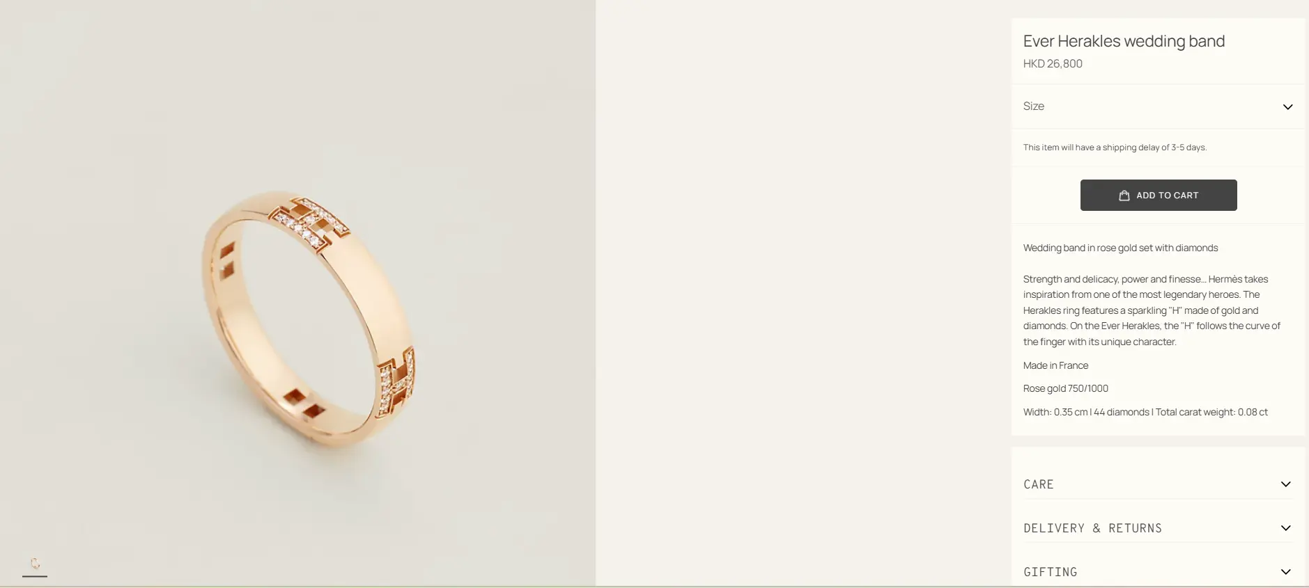 以希臘神話英雄Herakles為靈感,戒指用玫瑰金或白金打造,鑲嵌「H」字形鑽石,象徵力量同優雅。寬度得0.35-0.36 cm,戴上手夠輕巧,好岩作為情侶訂情或婚戒。