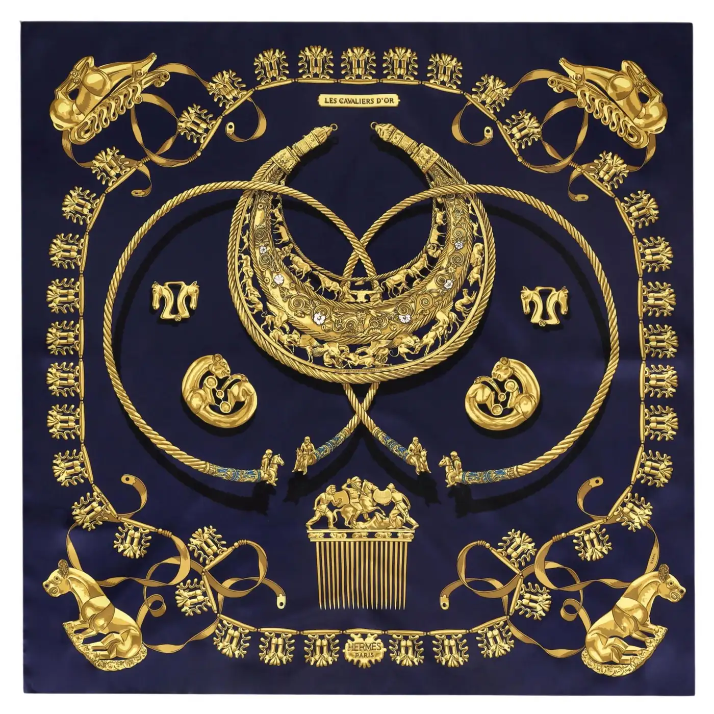 Hermès 首條絲巾喺 1937 年推出,第一個圖案名為 Jeu des Omnibus et Dames Blanches,由 Émile Hermès 女婿 Robert Dumas 設計,並成為其後一系列絲巾設計嘅開始。