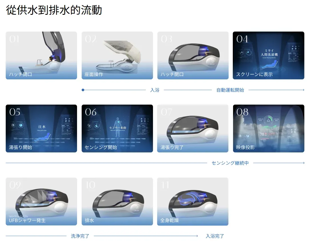 這個自動沖澡機概念並非全新。最早可追溯到 1970 年大阪世博會 當年展出嘅「超聲波浴缸」── 一種以科技輔助沖澡嘅巨型機器。當時因為技術及成本問題未能普及,但留低深刻印象。今日 Science 將呢個概念重新升級,用上現代科技打造商用版本。