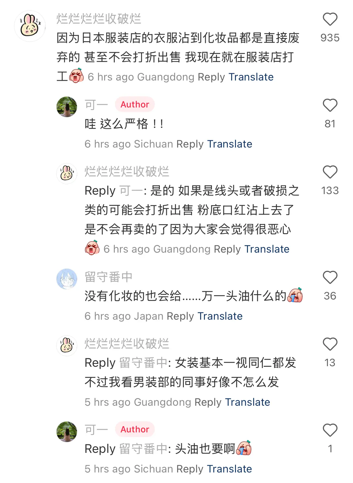 - 🧼 有喺日本服裝店做緊嘅人透露,衫一旦沾到化妝品就會直接報廢,唔會打折賣;線頭或破損可能會打折,但粉底口紅就唔會再賣,因為大家覺得好唔衛生。
