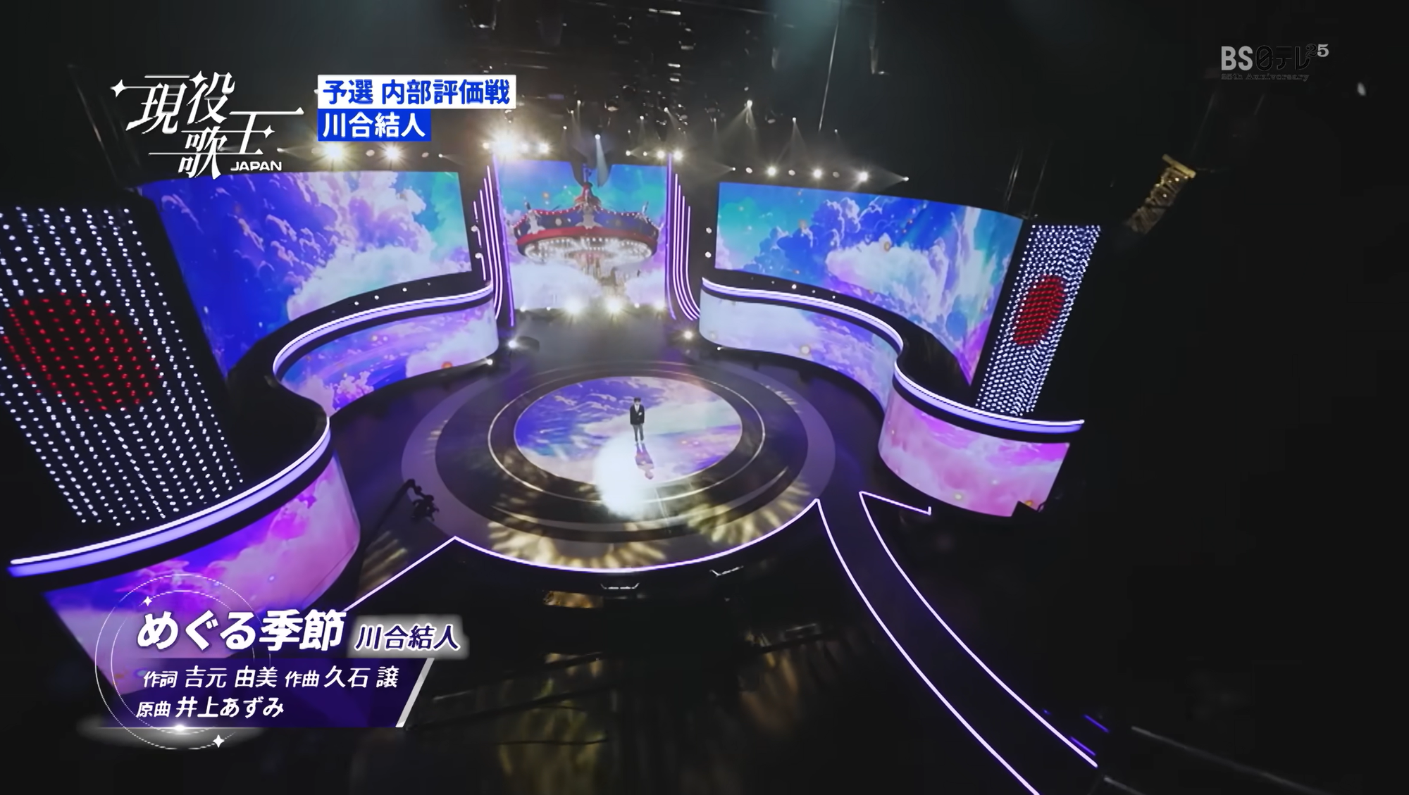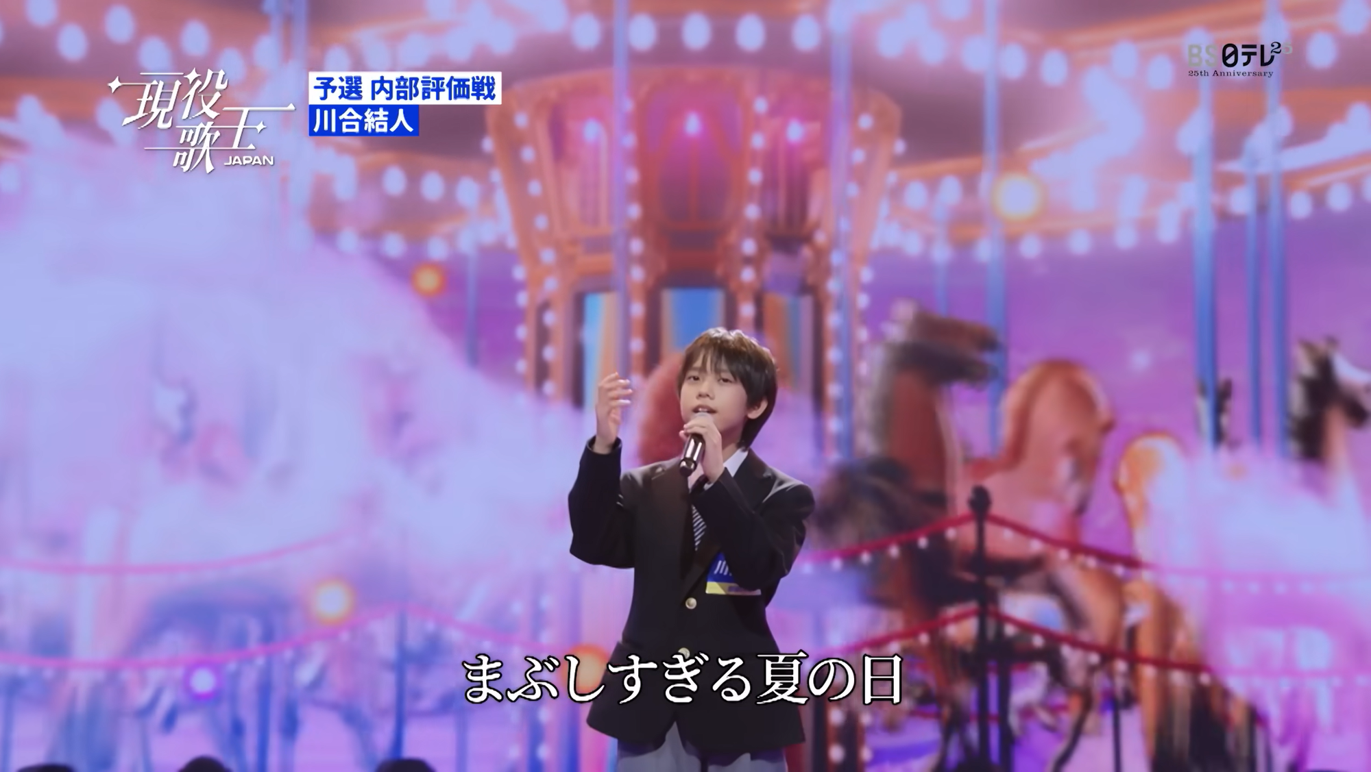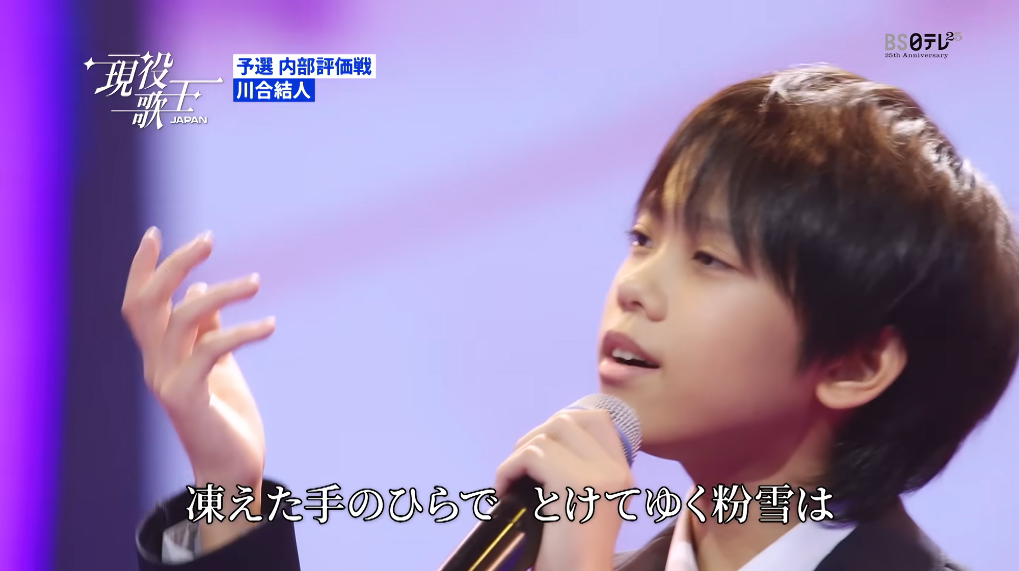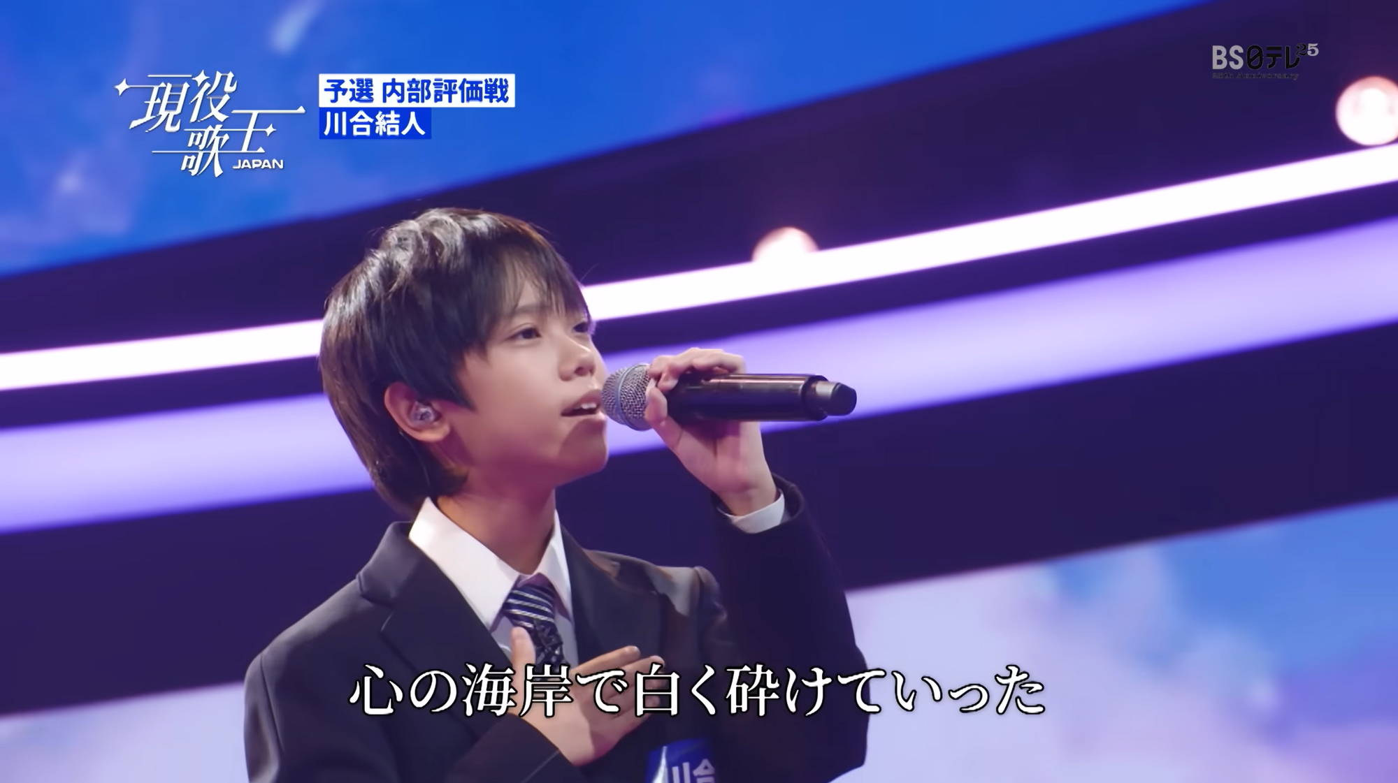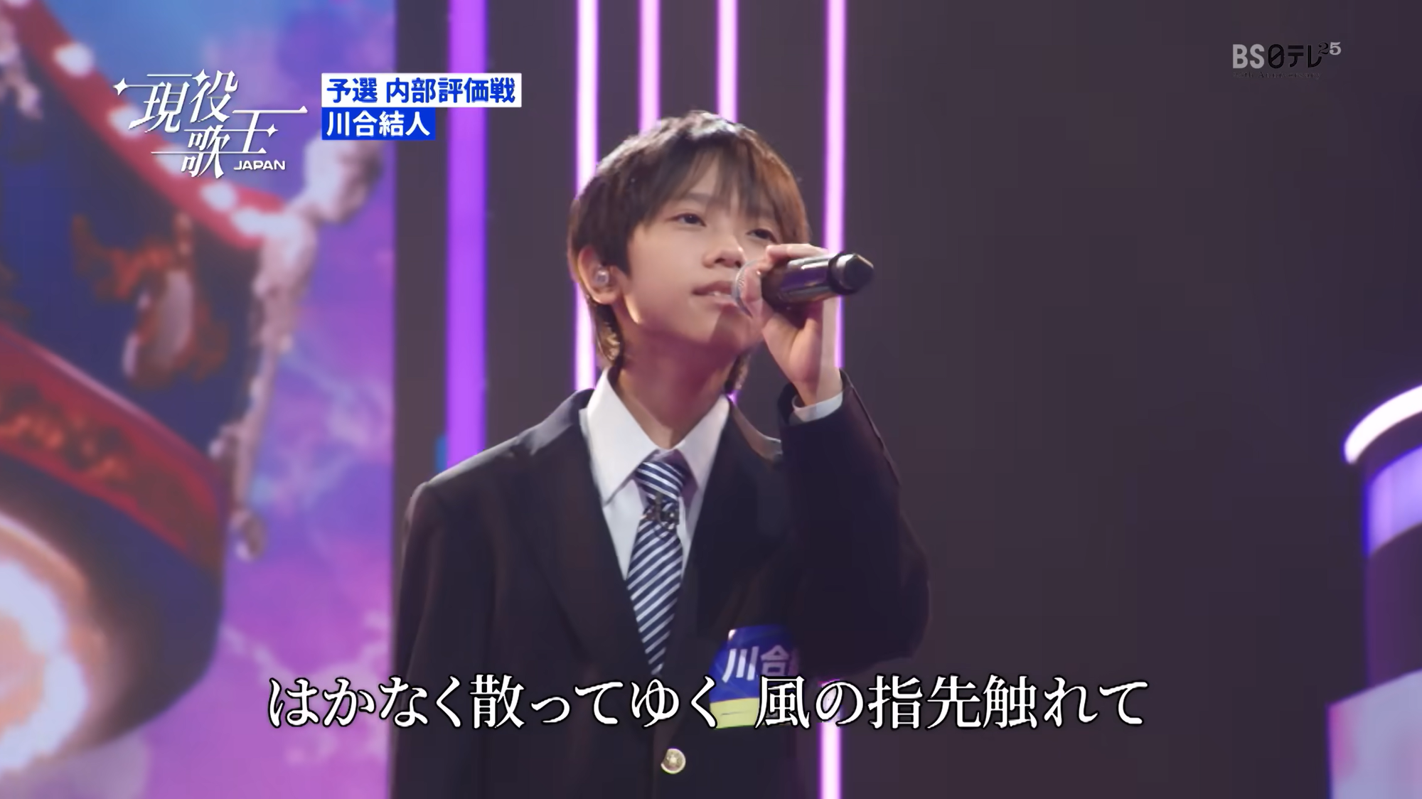 年僅13歲嘅川合結人喺《現役歌王 JAPAN》演唱吉卜力動畫《魔女宅急便》插曲《めぐる季節》。(資料來源:現役歌王JAPAN官方YouTube頻道)