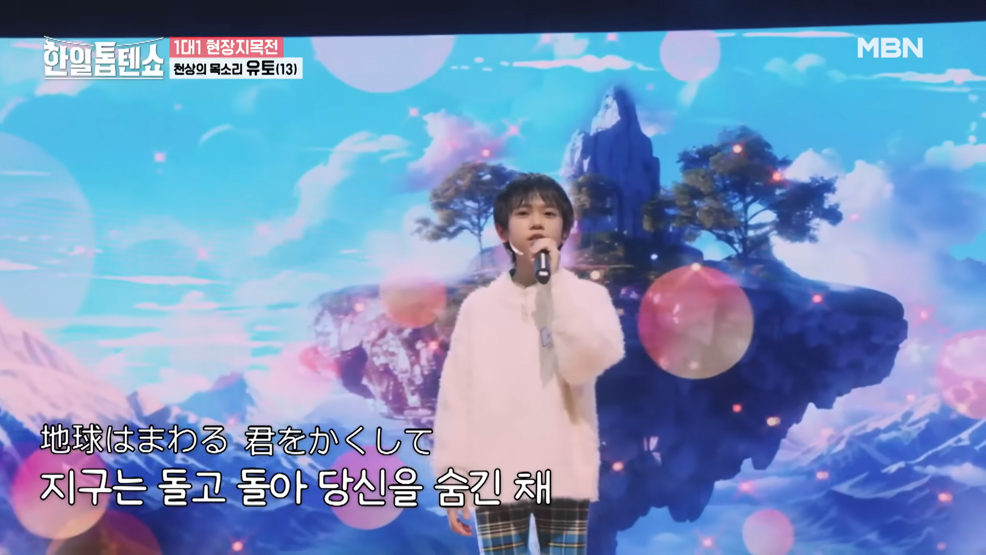 川合結人喺韓國節目《한日톱텐쇼》演唱另一首吉卜力動畫《天空之城》主題曲《君をのせて》。(資料來源:한日톱텐쇼官方YouTube頻道)