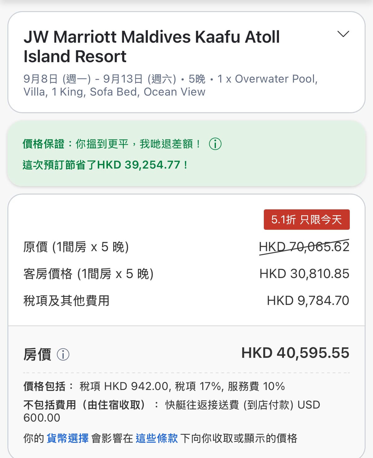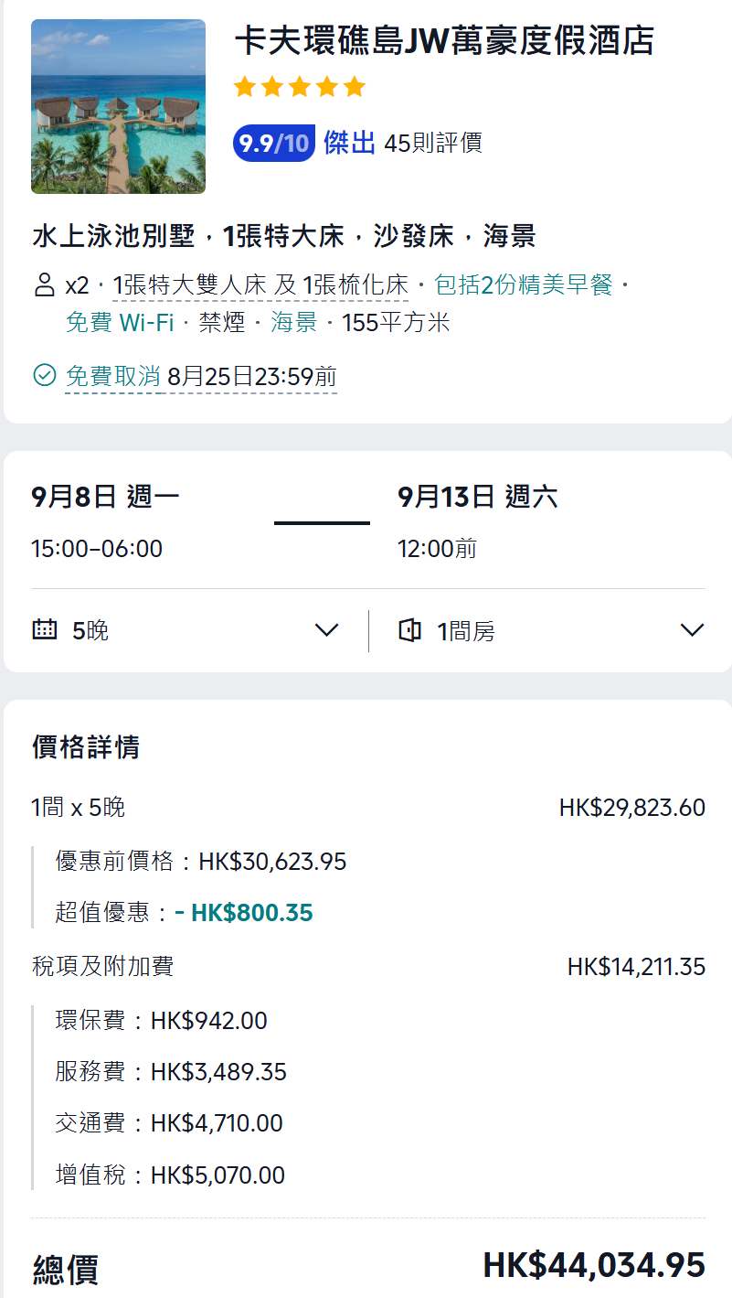 | 9月8–13日(5晚) | $44,034.95 | $40,595.55 | $43,335.00 | Agoda ✅ |