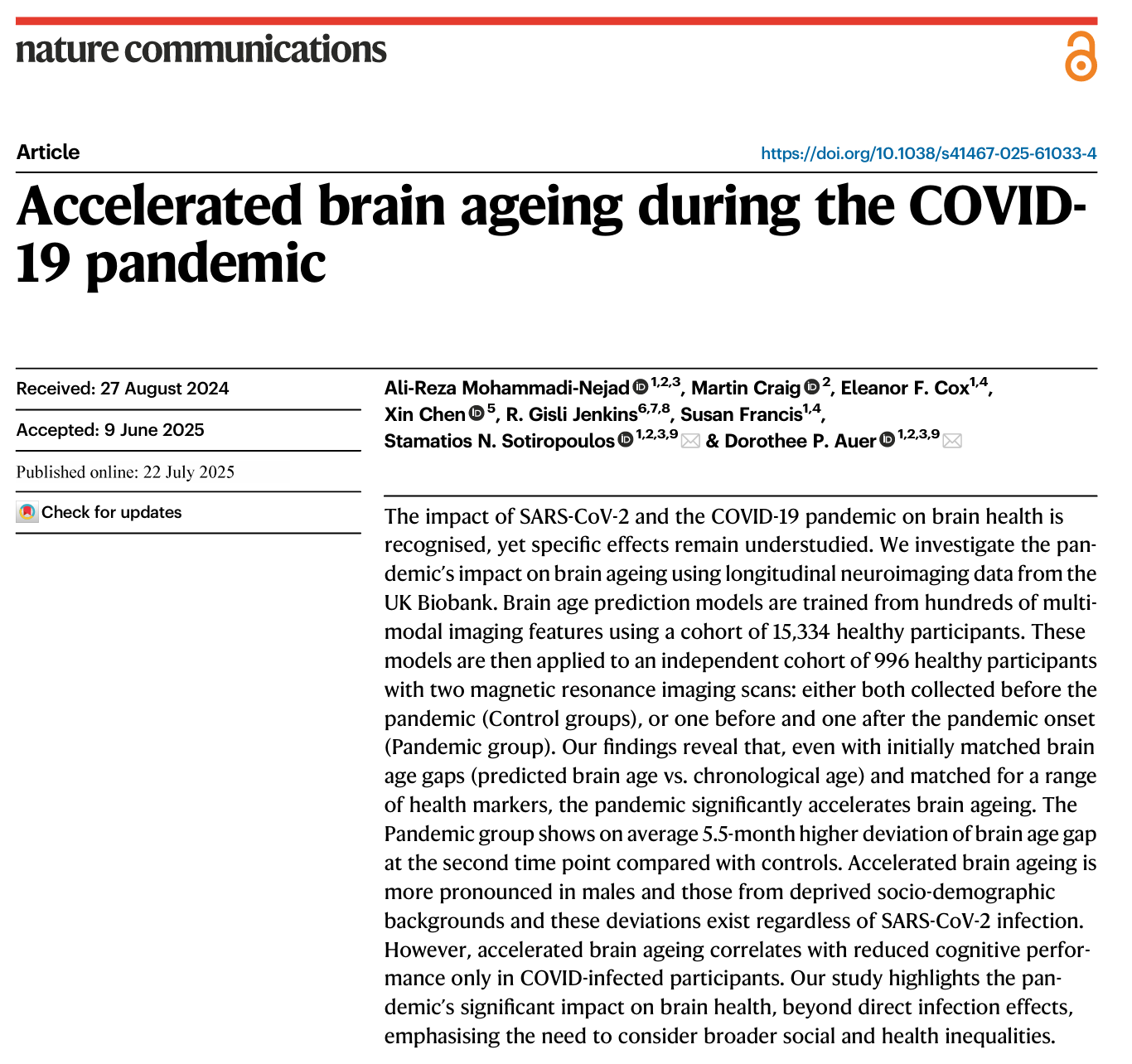 [1] Mohammadi-Nejad, A.-R., et al. (2025). Accelerated brain ageing during the COVID-19 pandemic. Nature Communications. DOI: 10.1038/s41467-025-61033-4