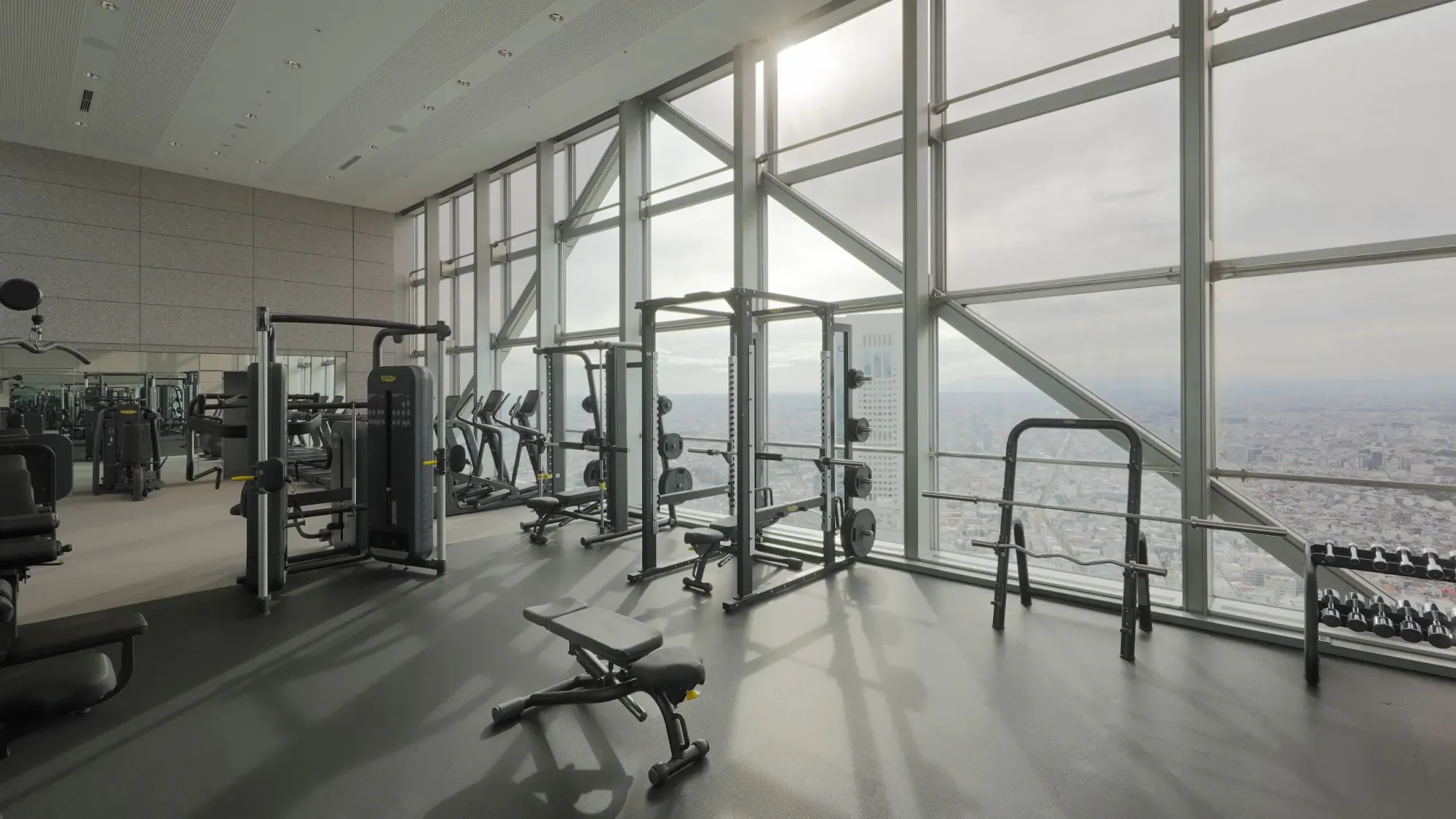 由電梯直達 41 樓大堂,映入眼簾係高樓底玻璃天幕與城市景觀,天氣好嘅日子甚至可以遠望富士山。翻新後嘅公共空間,仍然保留原有嘅幾何線條、深色地毯同木系元素,但整體色調同照明更柔和,少咗 90 年代嘅厚重感。