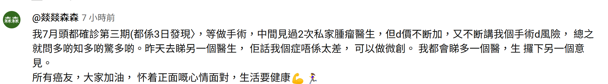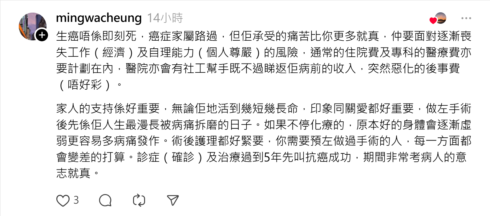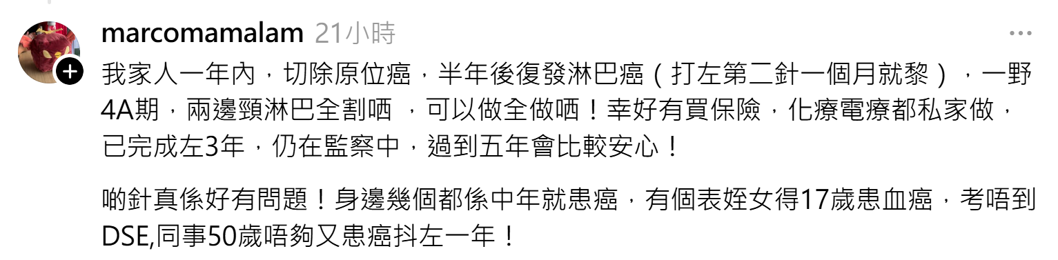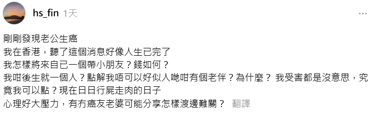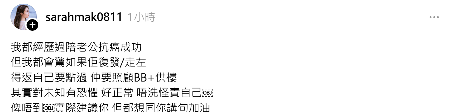 就如網民 @hs_fin 所講:「剛剛發現老公生癌 我在香港,聽了這個消息好像人生已完了 我怎樣將來自已一個帶小朋友?錢如何? 我咁後生就一個人?點解我唔可以好似人哋咁有個老伴?為什麼? 我受害都是沒意思,究竟我可以點?現在日日行屍走肉的日子 心理好大壓力,有冇癌友老婆可能分享怎樣渡邊難關?」——肺腑說話,道出咗患病唔止係病人受苦,而係屋企人一齊跌入困境💔。