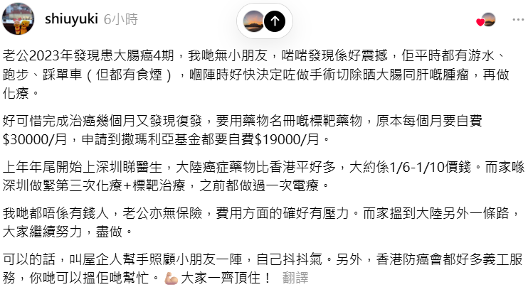 @shiuyuki :老公無保險,用標靶藥每月要$30,000,自費都要$19,000……真係好有壓力。」佢哋靠撒瑪利亞基金、深圳求醫,努力搵平啲嘅藥,但明言「大家繼續頂住」。