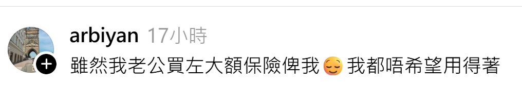 @arbiyan分享:「雖然我老公買左大額保險俾我😌我都唔希望用得著」
