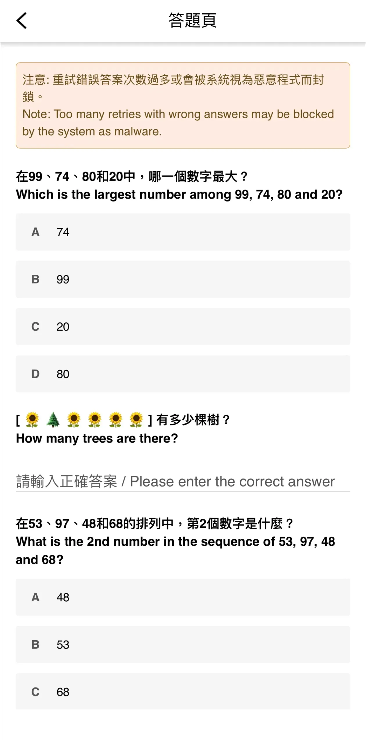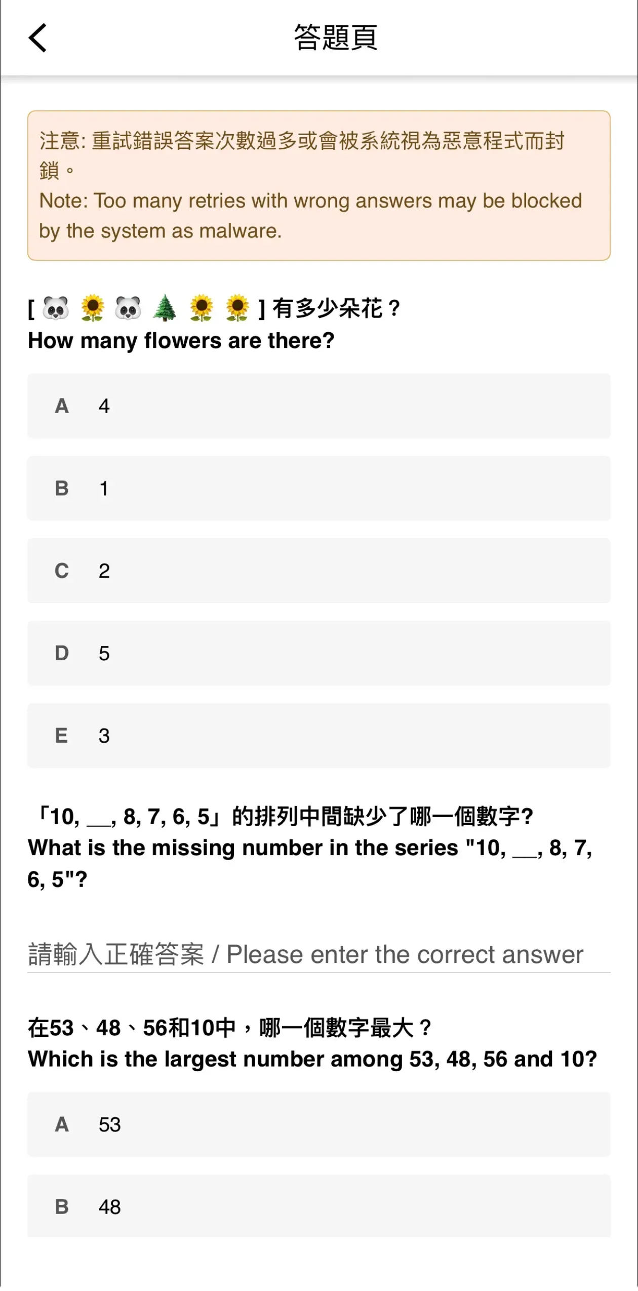 - 系統跳轉去答題頁,要答 3 條問題先可以繼續。