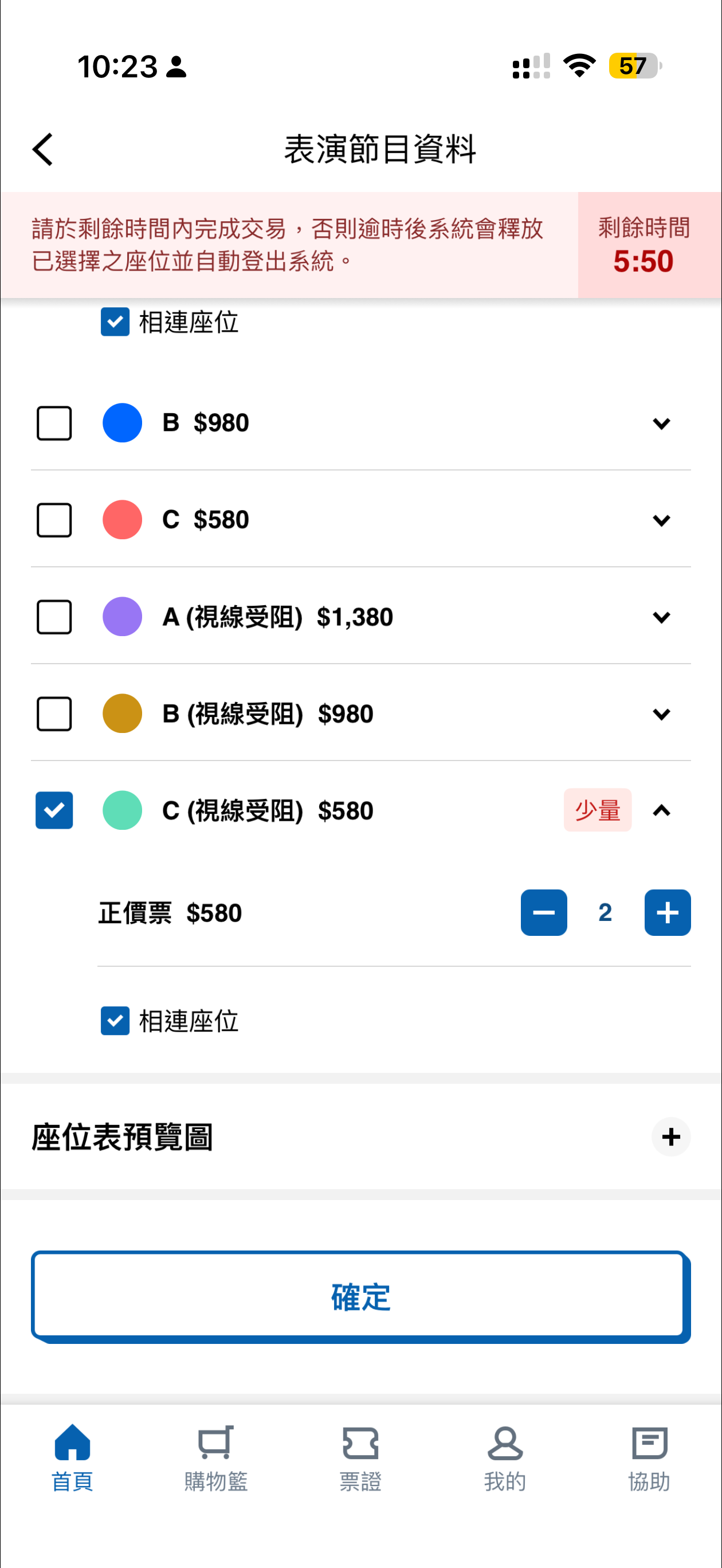 Step 6|10:22-29am:進入選位頁,開始8分鐘倒數!(資料來源:URBTIX官方網站)