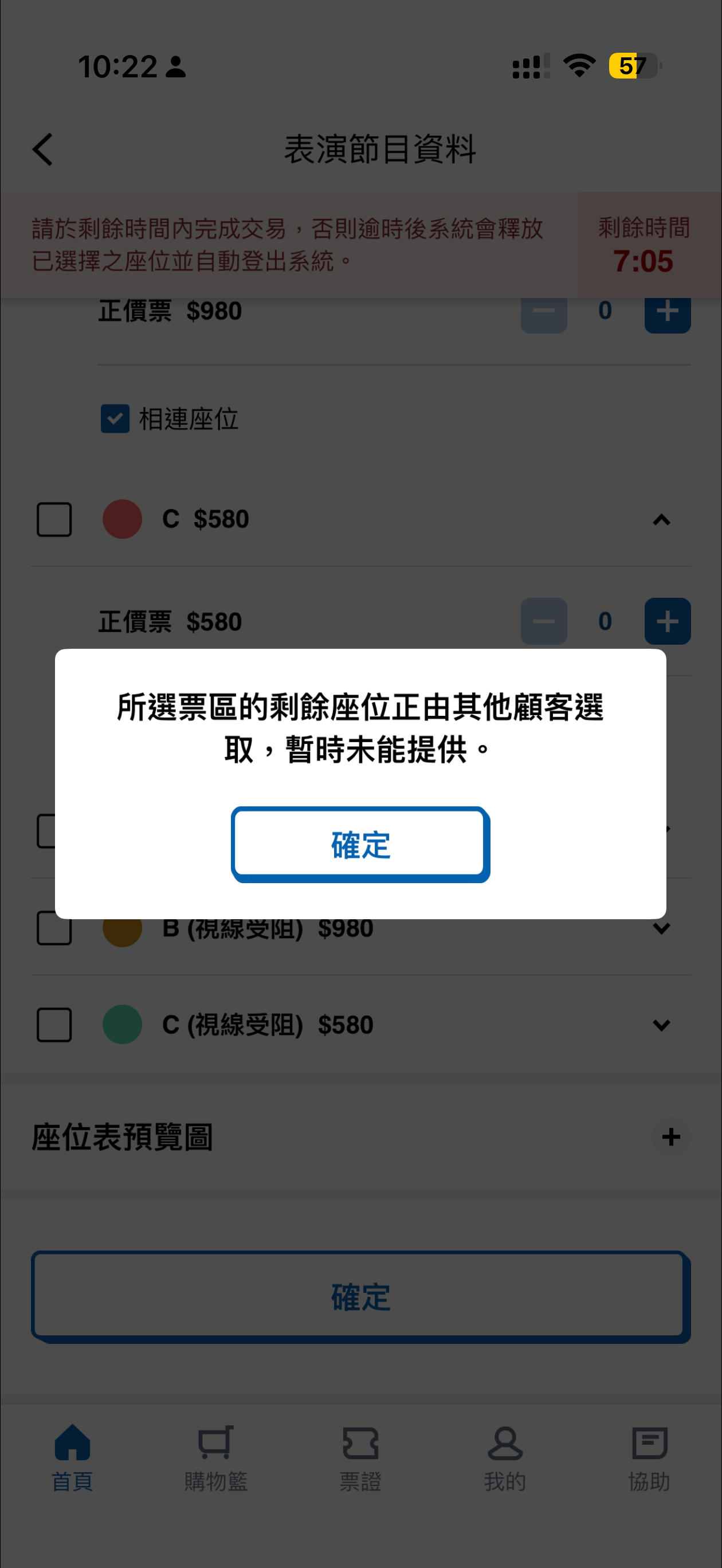 - 小編因為揀位太慢,超過 8 分鐘,系統彈出「超過購票時間」。