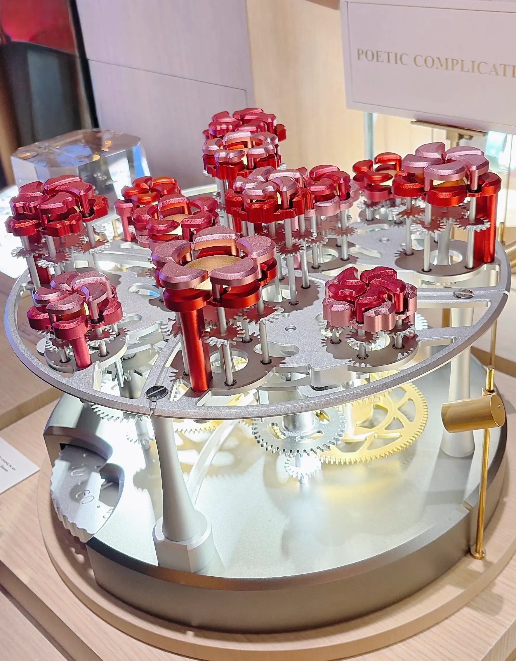 展覽現場其中一個最具說明力嘅部分,係放大展示花開錶盤內部結構嘅裝置。參觀者可以親手操作,直接睇到花瓣點樣隨住齒輪同凸輪結構開合。