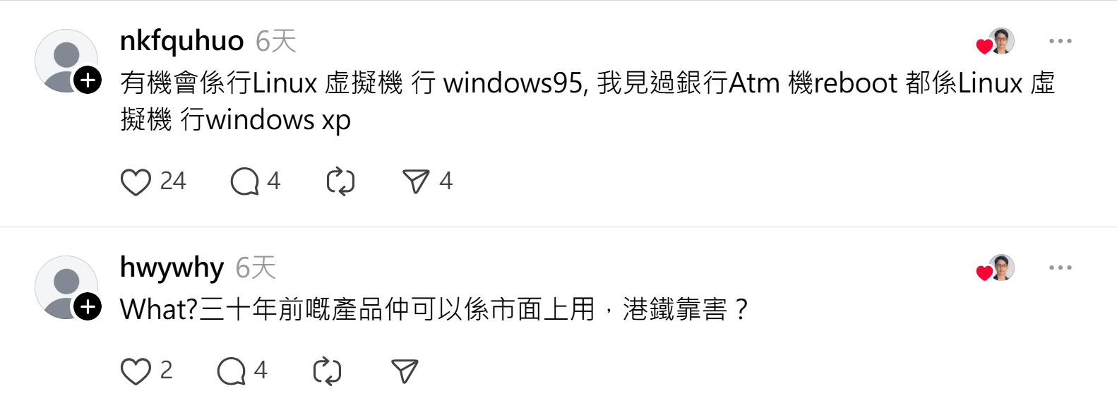 「有機會係行 Linux 虚擬機 行 Windows 95,我見過銀行 ATM 機 reboot 都係咁樣,行 Windows XP!」