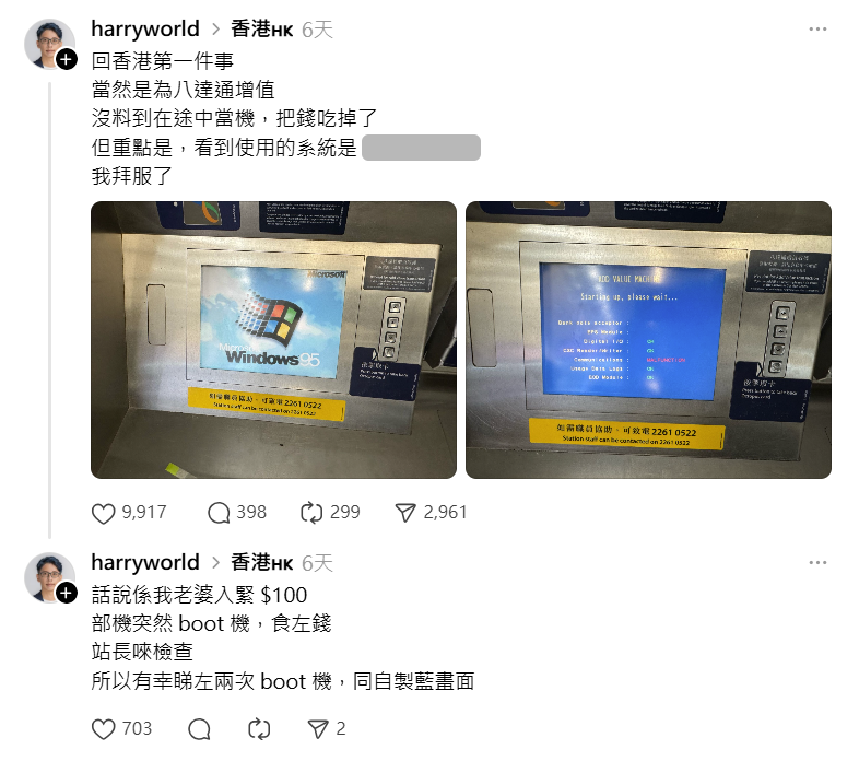 近日有網民喺使用八達通增值機時,突然當機,螢幕竟然閃現出 Windows 95 嘅畫面,彷彿一秒回到九十年代!事件喺網絡上迅速引發熱議,不少人感到震驚又懷舊,紛紛留言分享自己對呢個古老作業系統嘅回憶。(編按:唔係回憶,係未出世⋯⋯)